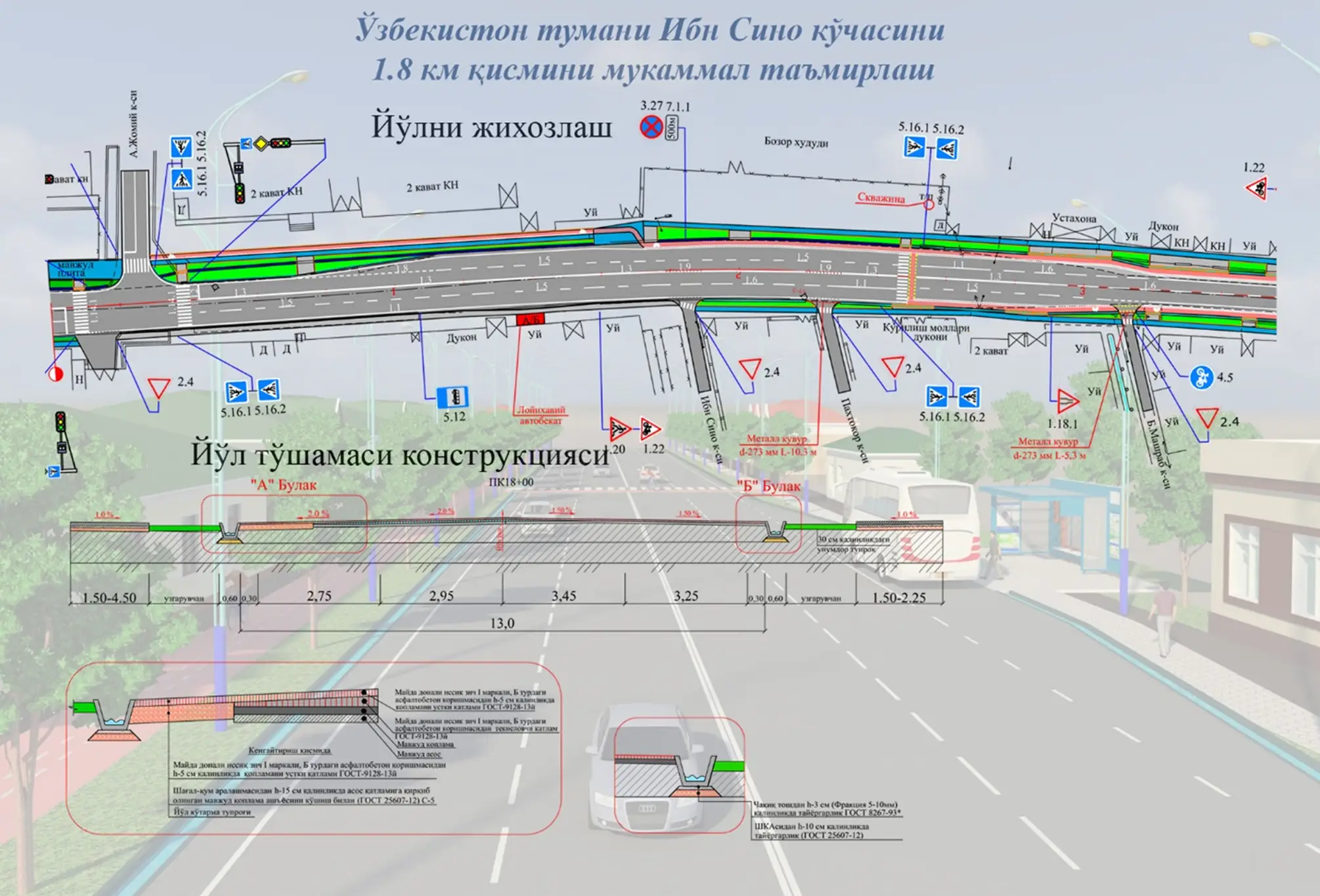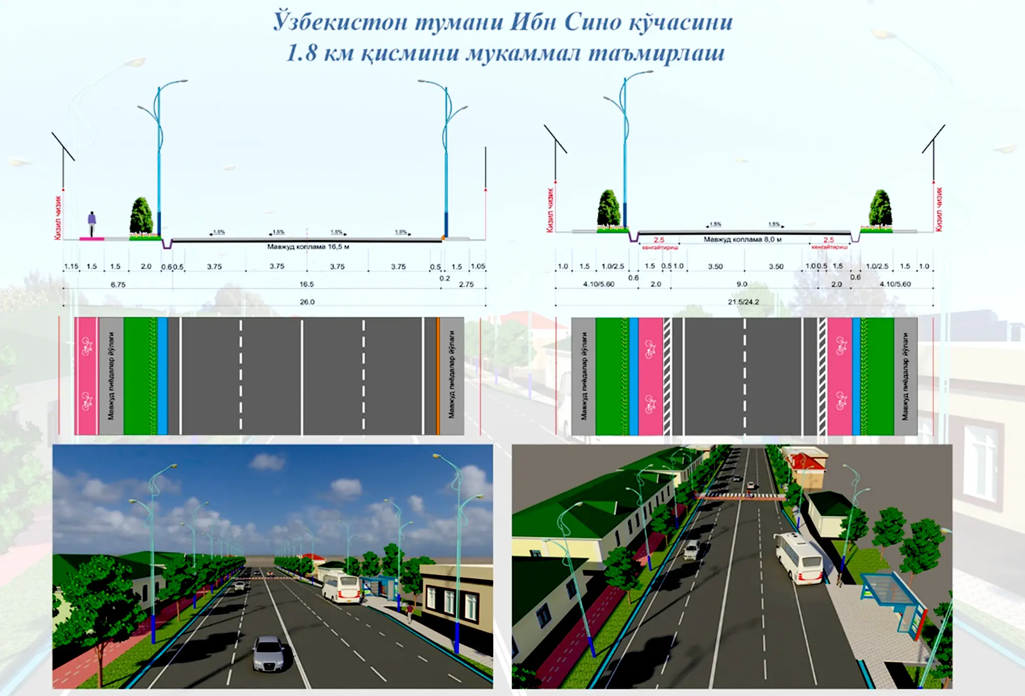 - Fargʼona viloyati Oʼzbekiston tuman markaziy koʼchalarini toʼla taʼmirlash - 1.8 km.