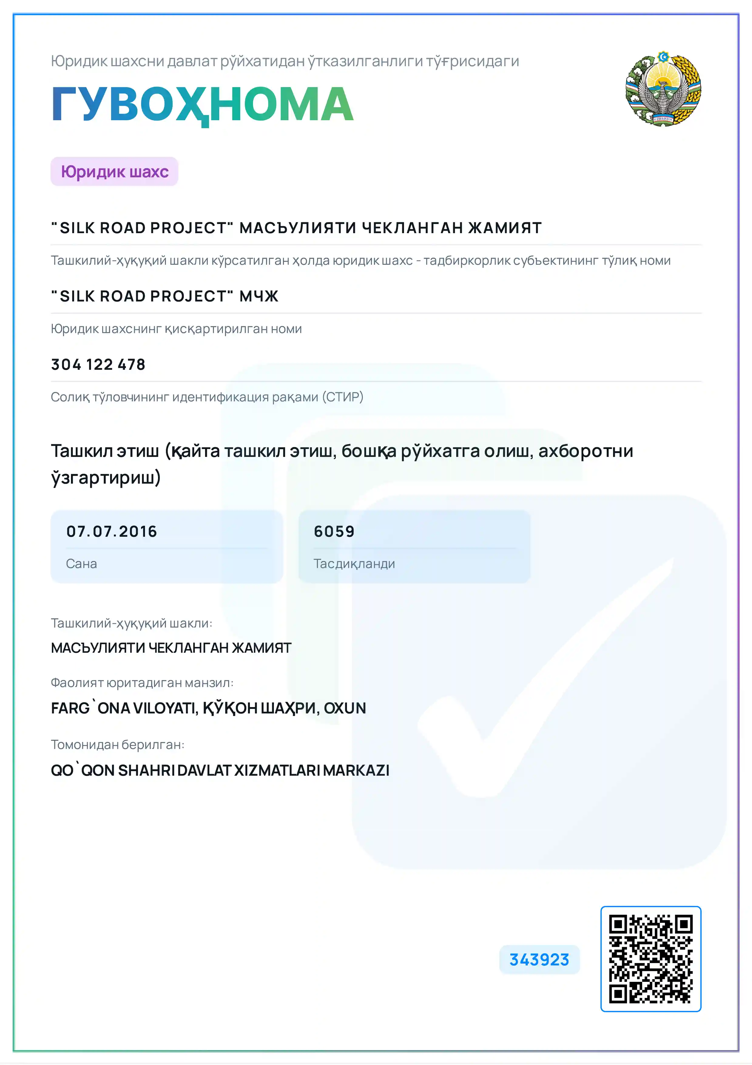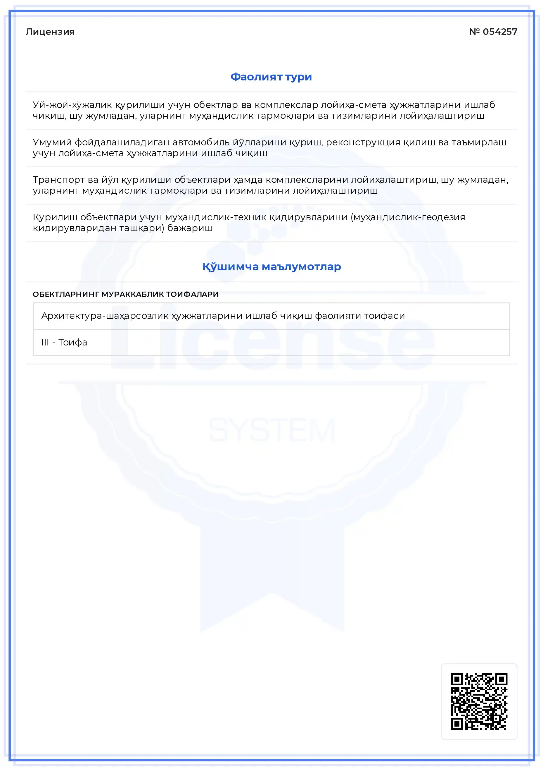 Barcha faoliyat turlarini amalga oshirish uchun tegishli Litsenziyalar mavjud.